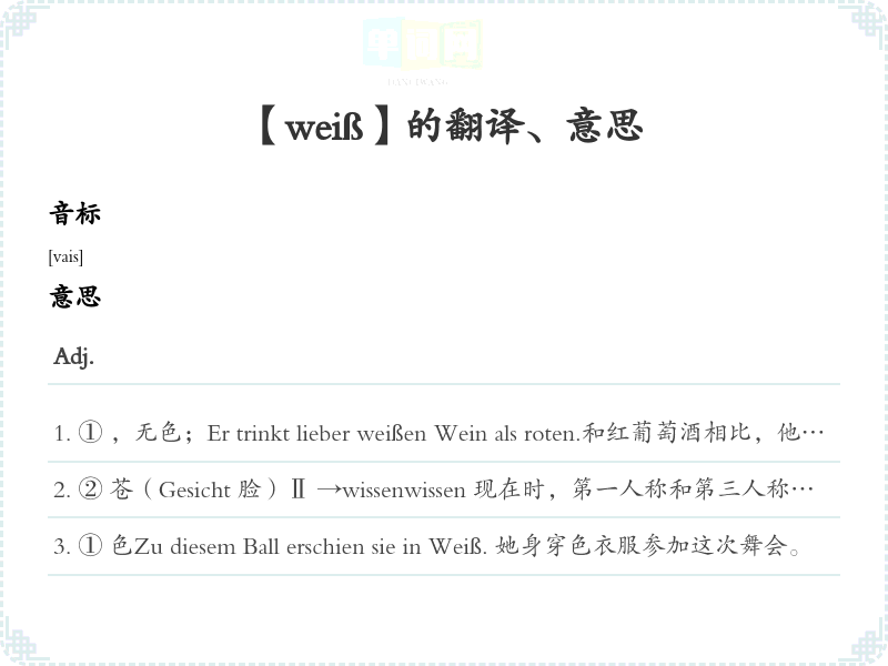 ① ,无色;Er trinkt lieber weißen Wein als roten.和红葡萄酒相比,他更喜欢喝葡萄酒。Er ist in den letzten Jahren ganz weiß geworden.最近几年来他头发全了。