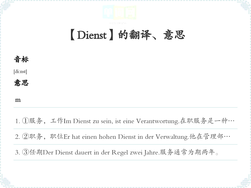 ②职务,职位Er hat einen hohen Dienst in der Verwaltung.他在管理部门担任高级职务。