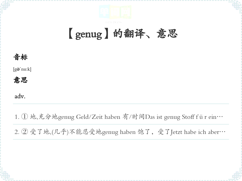 ② 受了地,(几乎)不能忍受地genug haben 饱了,受了Jetzt habe ich aber genug! 现在我可没耐心了。Er ist schon alt genug, um das zu verstehen.他已经大了,能理解这件事了。Es ist noch nicht warm genug für kurze Hosen.天气不太暖,不能穿短裙。Das Problem ist schwierig genug.这问题刺手了。Das ist schlimm genug!这糟了!