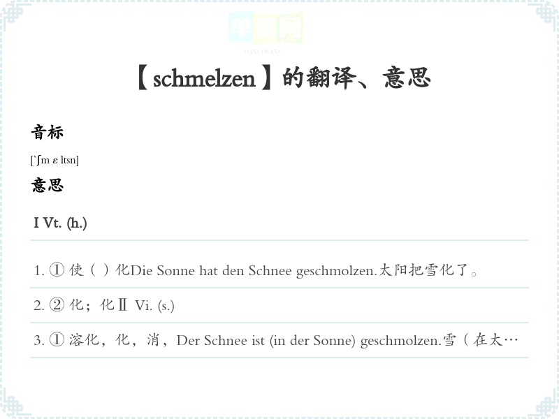 ① 溶化,化,消,Der Schnee ist (in der Sonne) geschmolzen.雪(在太阳下)化了。