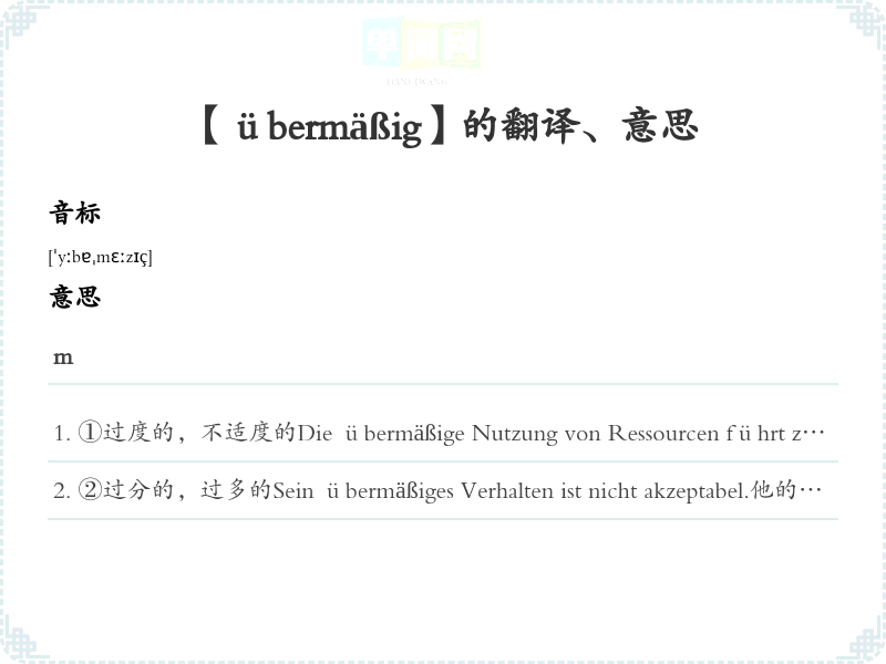 ①过度的,不适度的Die übermäßige Nutzung von Ressourcen führt zu Problemen.资源的过度利用导致问题。