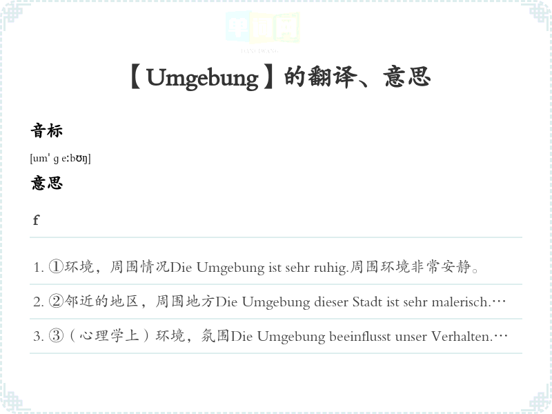 ①环境,周围情况Die Umgebung ist sehr ruhig.周围环境非常安静。