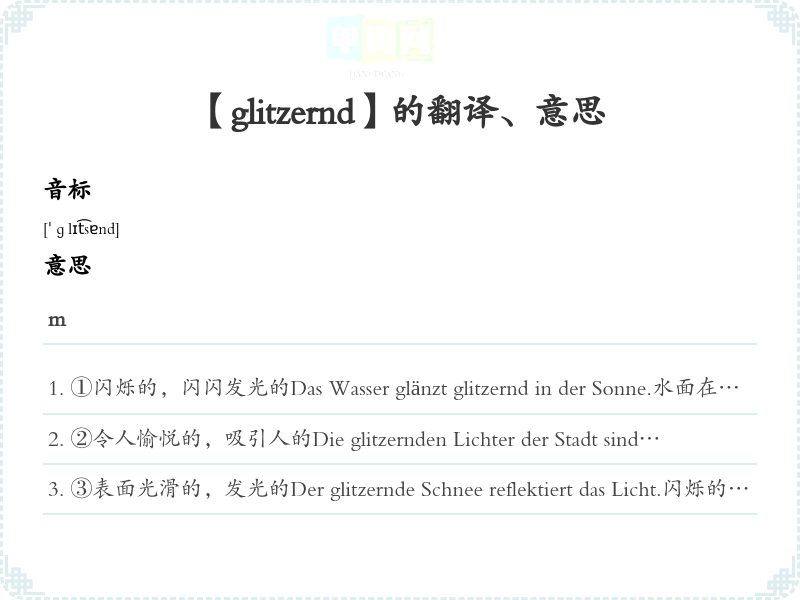 ①闪烁的,闪闪发光的Das Wasser glänzt glitzernd in der Sonne.水面在阳光下闪闪发光。