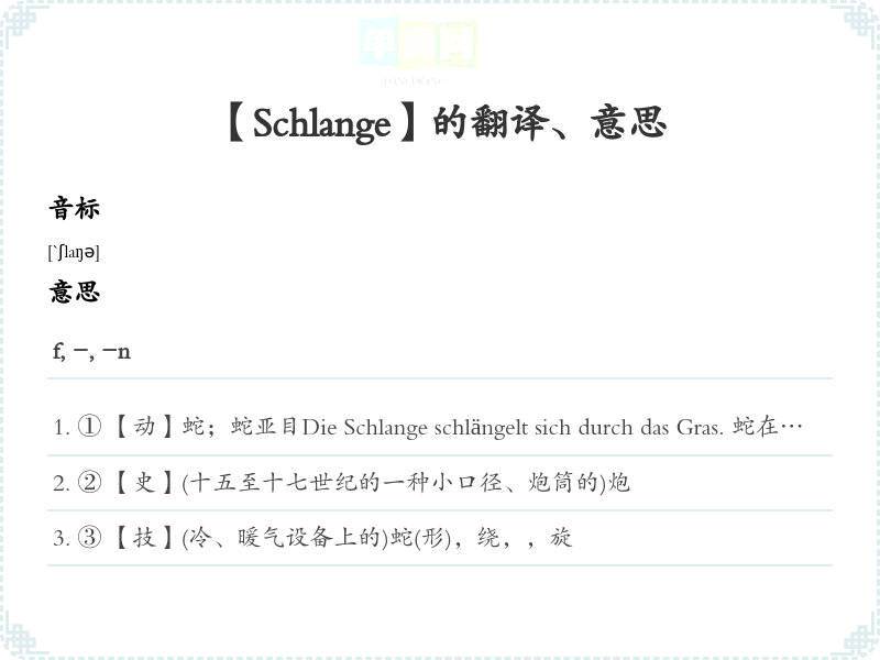 ① 【动】蛇;蛇亚目Die Schlange schlängelt sich durch das Gras. 蛇在草丛中蜿蜒游去。