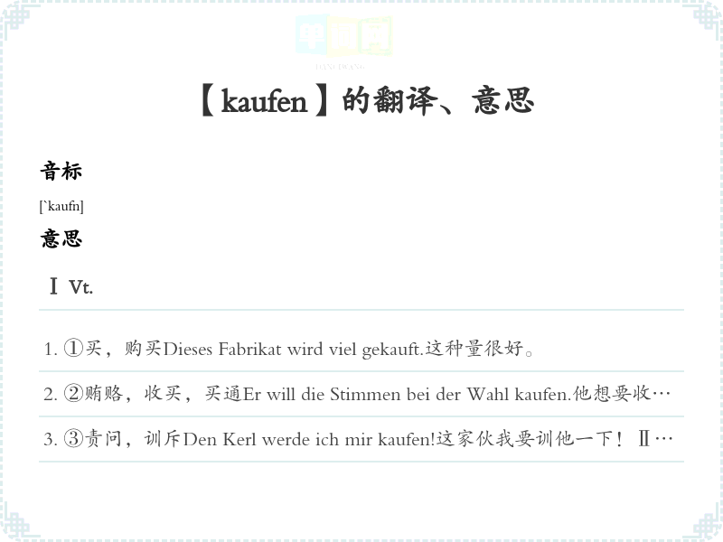 ③责问,训斥Den Kerl werde ich mir kaufen!这家伙我要训他一下!Ⅱ Vi.买Bei wem kaufen Sie?您在哪家商店买东西?语法搭配+四格, sich+三格, sich+四格, +三格, mit+三格, von+三格, bei+三格