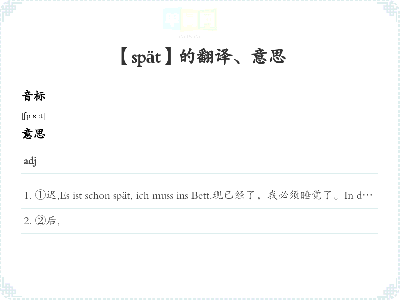 ①迟,Es ist schon spät, ich muss ins Bett.现已经了,我必须睡觉了。In den späten Sechzigerjahren kam es zu großen Demonstrationen der Studenten.六十年代后发生了大规模学生游行。einen späteren Zug nehmen 乘坐些候火车