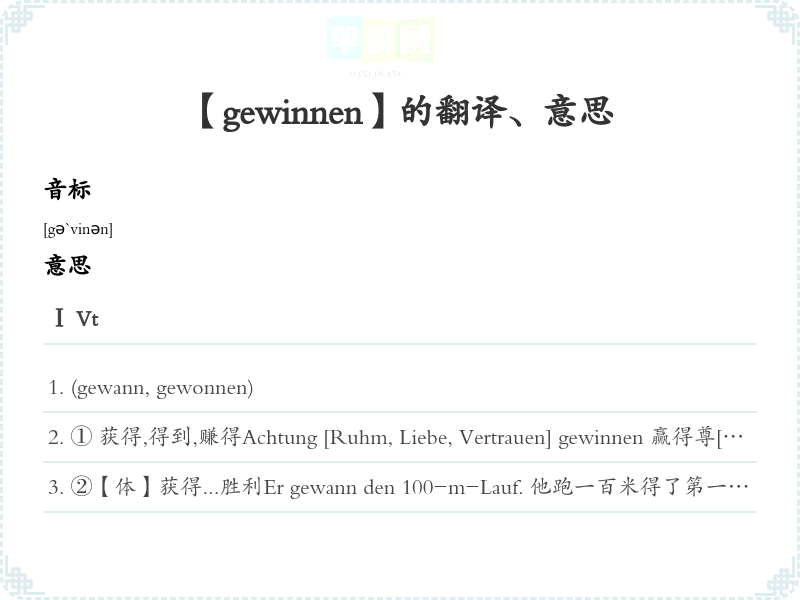 ① 获得,得到,赚得Achtung [Ruhm, Liebe, Vertrauen] gewinnen 赢得尊[,爱情,信任]