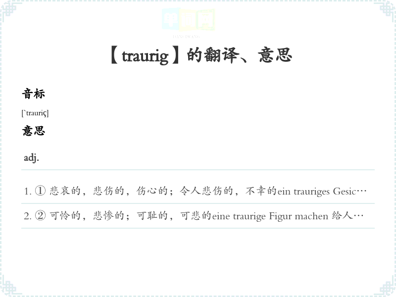 ① 悲哀的,悲伤的,伤心的;令人悲伤的,不幸的ein trauriges Gesicht machen做出一副的样子Bist du traurig darüber, dass wir ihn nicht wieder sehen werden? 你是不是因没见他感?Es ist traurig, dass du das nicht einsiehst.你没看出这点真遗憾!Das Traurige daran ist, dass ... 令人痛惜的是...