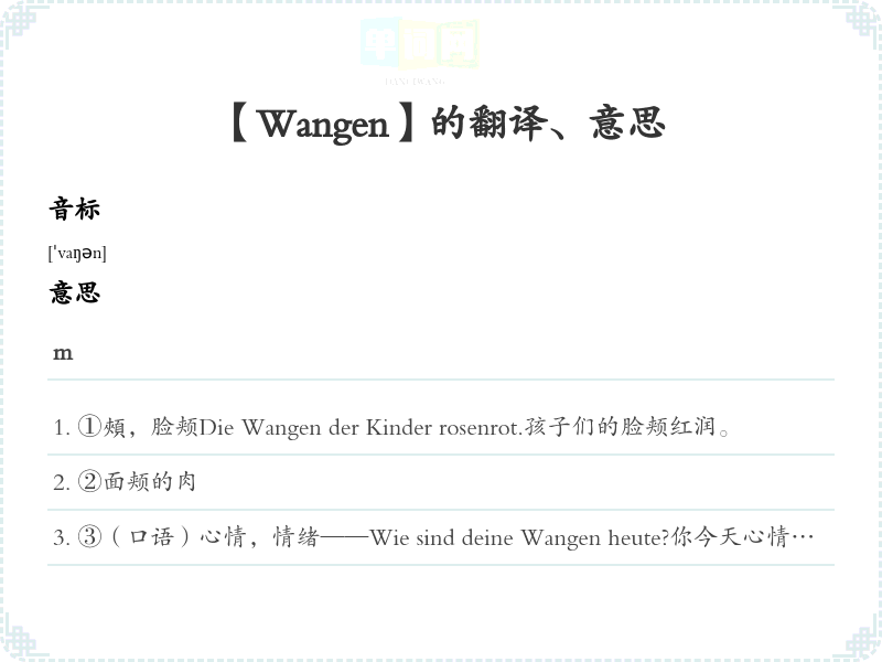 ③(口语)心情,情绪——Wie sind deine Wangen heute?你今天心情如何?