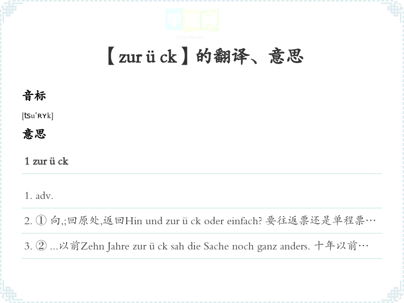 ① 向,;回原处,返回Hin und zurück oder einfach? 要往返票还是单程票?Er ging aus Vorsicht einen Schritt zurück. 小心地了一步。