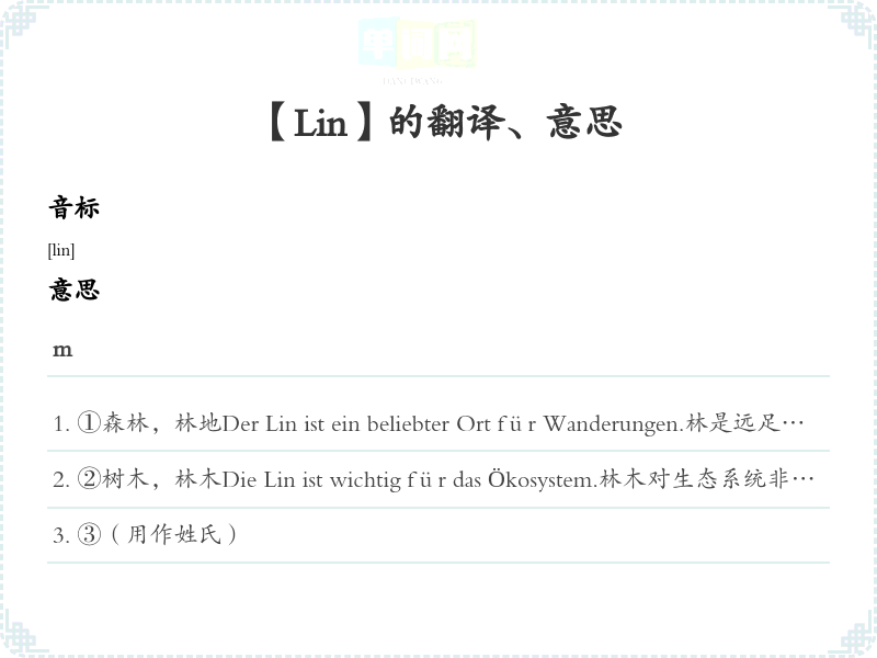 ①森林,林地Der Lin ist ein beliebter Ort für Wanderungen.林是远足的热门地点。