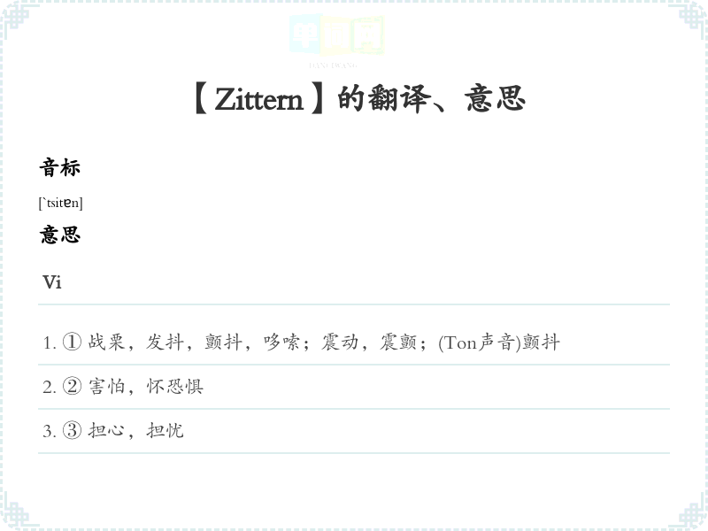 ① 战栗,发抖,颤抖,哆嗦;震动,震颤;(Ton声音)颤抖