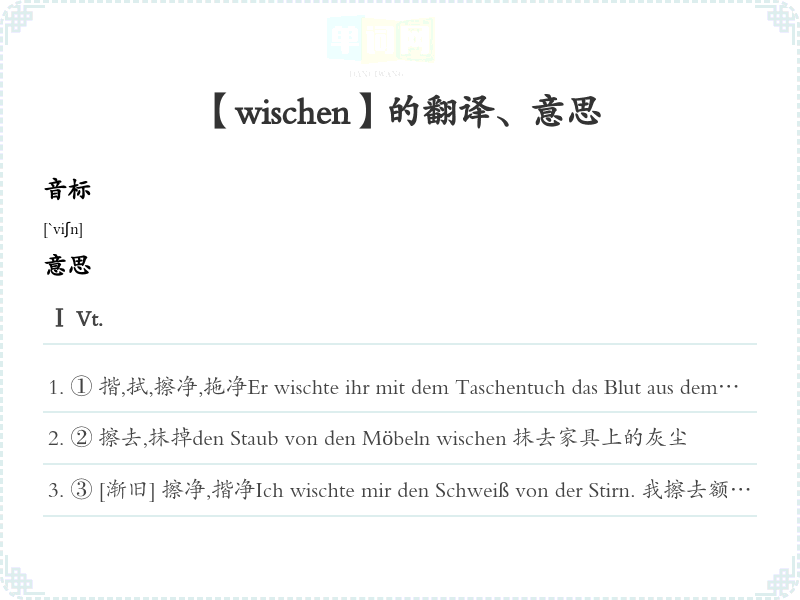 掸,拂,拭,擦mit der Hand über den Tisch wischen 用手擦了擦桌子Er wischte sich(D) mit dem Ärmel über die Stirn. 他用衣袖擦前额。Ⅲ Vi(s)飞奔Der Hund wischte um die Ecke. 狗绕过屋角迅速奔去。语法搭配sich+三格, +四格, mit+三格, über+四格