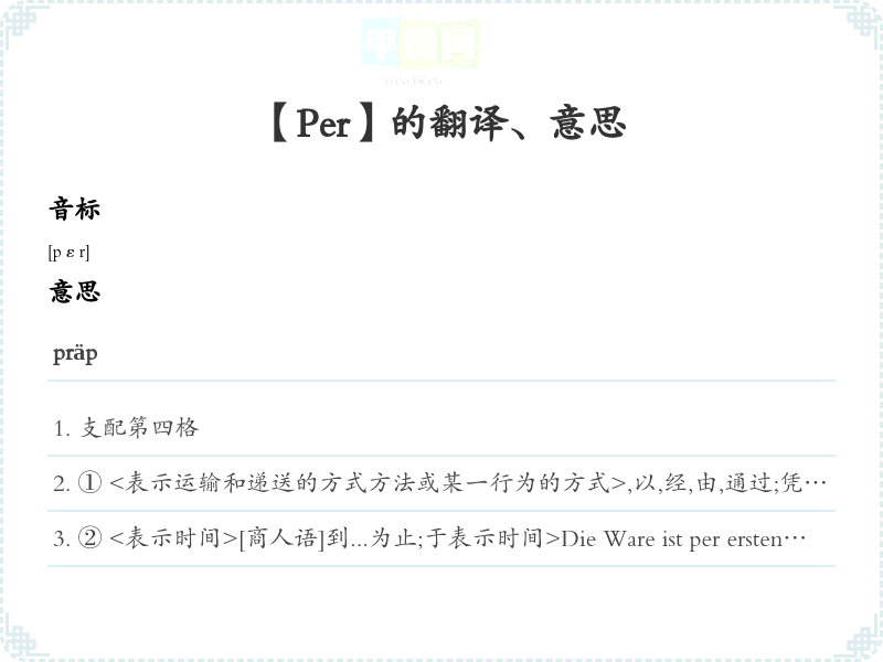 ① <表示运输和递送的方式方法或某一行为的方式>,以,经,由,通过;凭表示运输和递送的方式方法或某一行为的方式>per Bahn, Flugzeug, Post 由火车,飞机,邮政运送