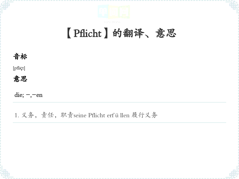 义务,责任,职责seine Pflicht erfüllen 履行义务