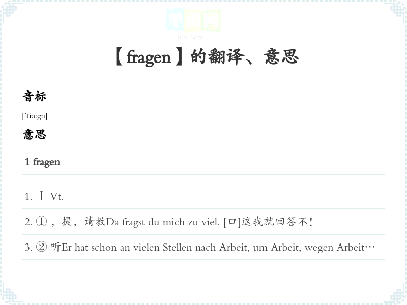 ② 听Er hat schon an vielen Stellen nach Arbeit, um Arbeit, wegen Arbeit gefragt. 他许多部门找工作。Ⅱ Vi.及,关心Der Vater fragte nicht nach den Kindern. 爸爸不关心他的孩子们。Ⅲ Vr.思考,自Ich frage mich, ob ich das tun kann. 我自我是否能这么做。Es fragt sich nur, ob ich kommen kann. 我能不能来还是题。2 Fragef; -, -n