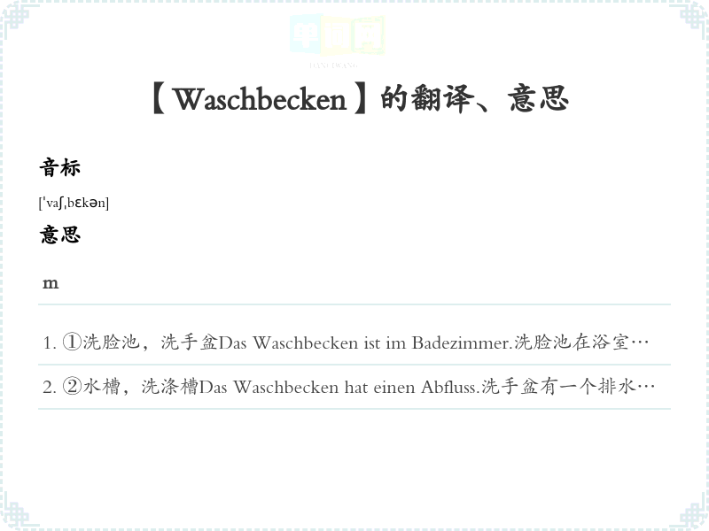 ①洗脸池,洗手盆Das Waschbecken ist im Badezimmer.洗脸池在浴室里。
