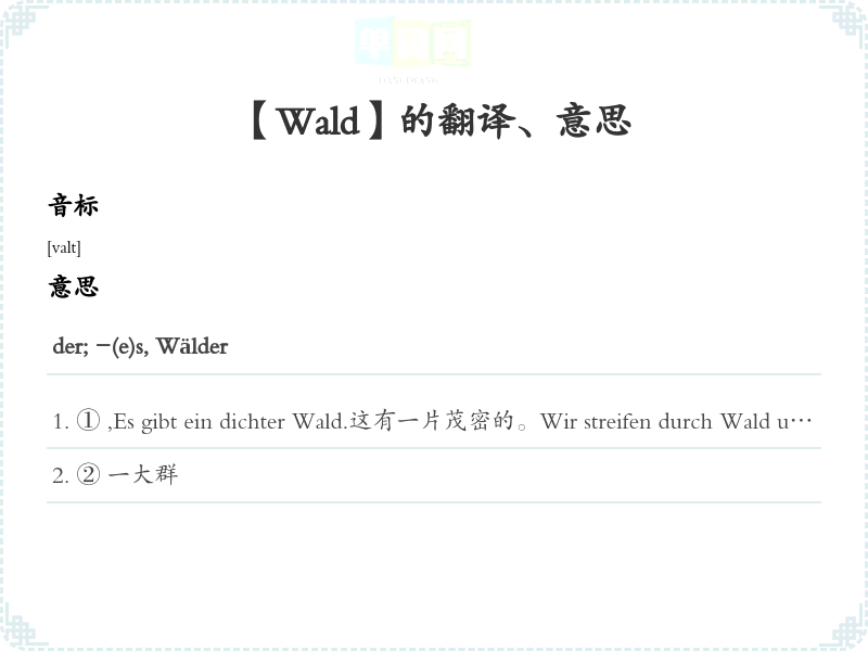 ① ,Es gibt ein dichter Wald.这有一片茂密的。Wir streifen durch Wald und Feld.我们漫游和田野。
