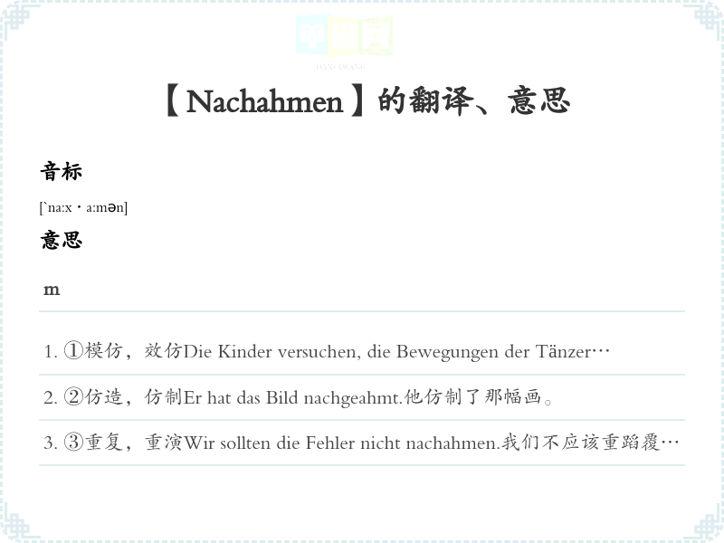 ①模仿,效仿Die Kinder versuchen, die Bewegungen der Tänzer nachzuahmen.孩子们试图模仿舞者的动作。