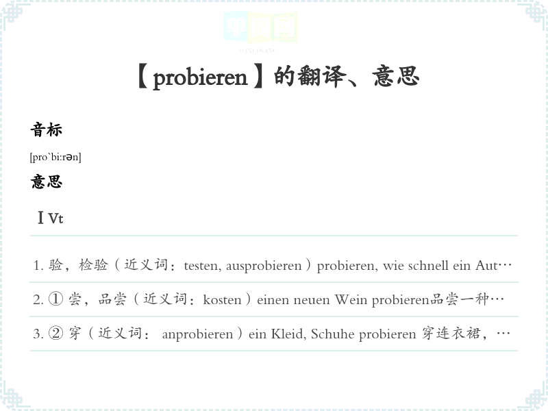 ① 尝,品尝(近义词:kosten)einen neuen Wein probieren品尝一种新葡萄酒probieren, ob genug Salz in der Suppe ist尝一汤里是否撒了盐Darf ich mal probieren? 我能尝一?