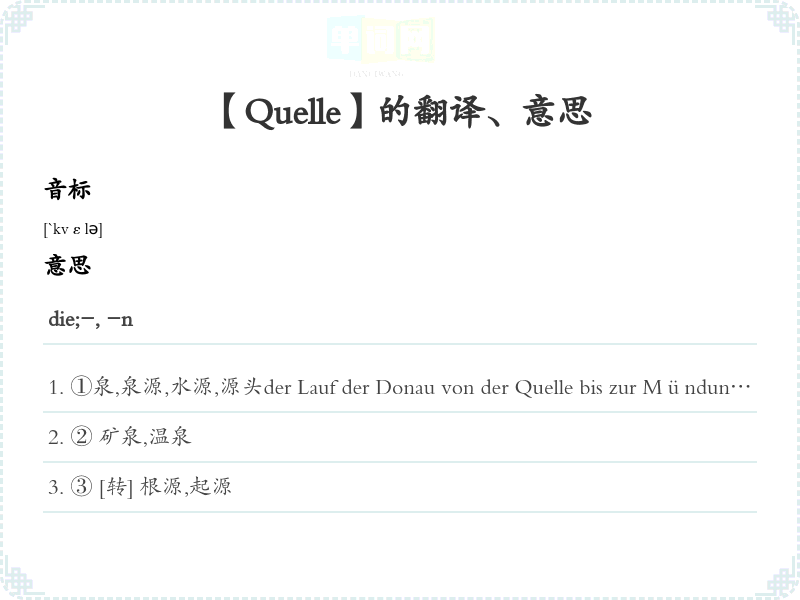 ①泉,泉源,水源,源头der Lauf der Donau von der Quelle bis zur Mündung多瑙河从源头到入海口的流程
