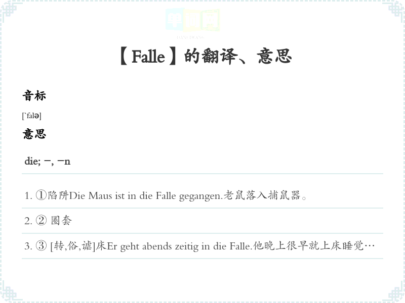 ③ [转,俗,谑]床Er geht abends zeitig in die Falle.他晚上很早就上床睡觉了。
