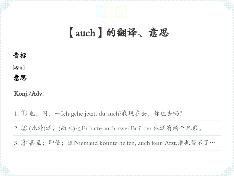 ② (此外)还,(而且)也Er hatte auch zwei Brüder.他还有两个兄弟。