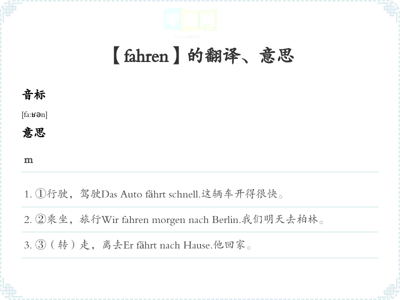 ②乘坐,旅行Wir fahren morgen nach Berlin.我们明天去柏林。