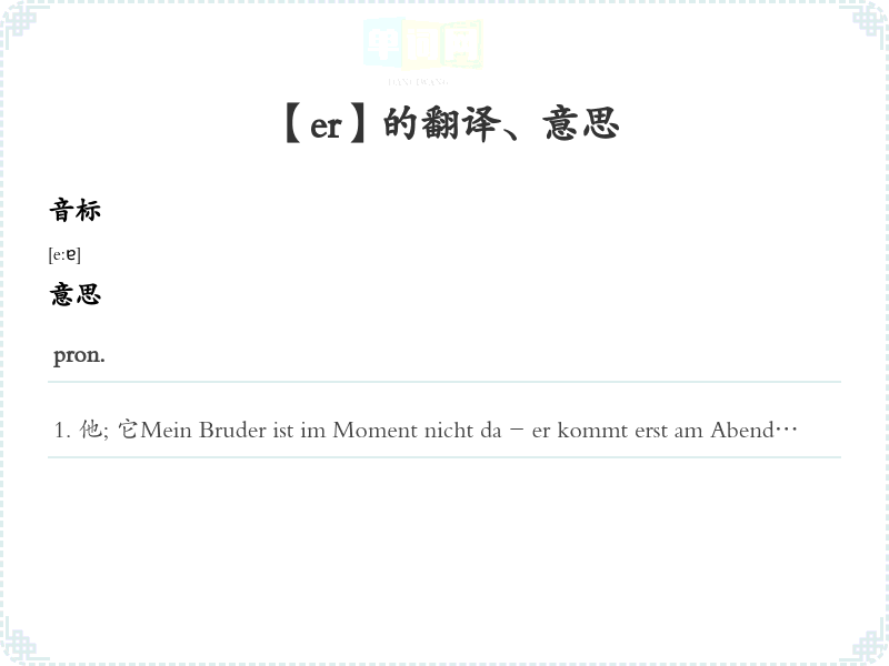 他; 它Mein Bruder ist im Moment nicht da - er kommt erst am Abend wieder.我兄弟现在不在——他晚上回来。Was ist denn mit dem Hund los? Er bellt die ganze Zeit.狗怎么啦?它没完没地叫。Ich habe mir den roten Rock gekauft. Er hat mir am besten gefallen. 我买红裙子,它很让我满意。
