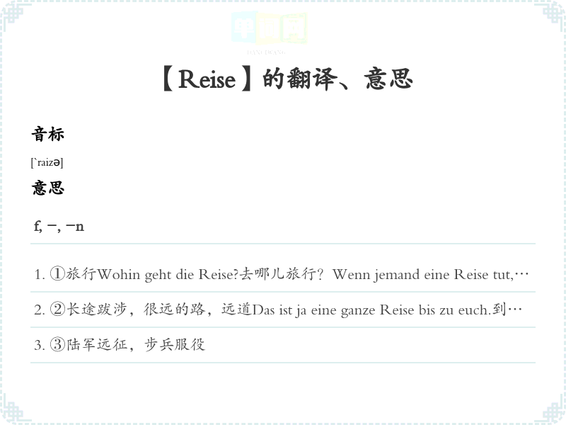 ②长途跋涉,很远的路,远道Das ist ja eine ganze Reise bis zu euch.到你们那儿简直是一次长途旅行。