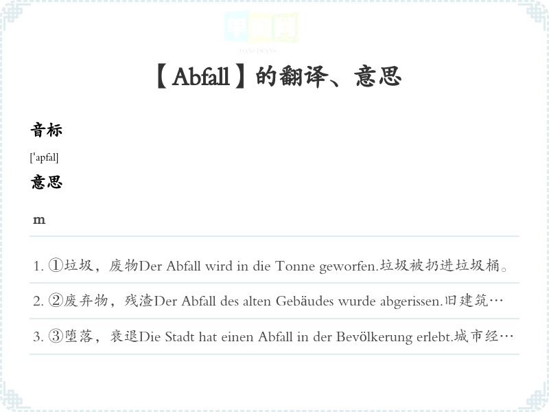 ①垃圾,废物Der Abfall wird in die Tonne geworfen.垃圾被扔进垃圾桶。