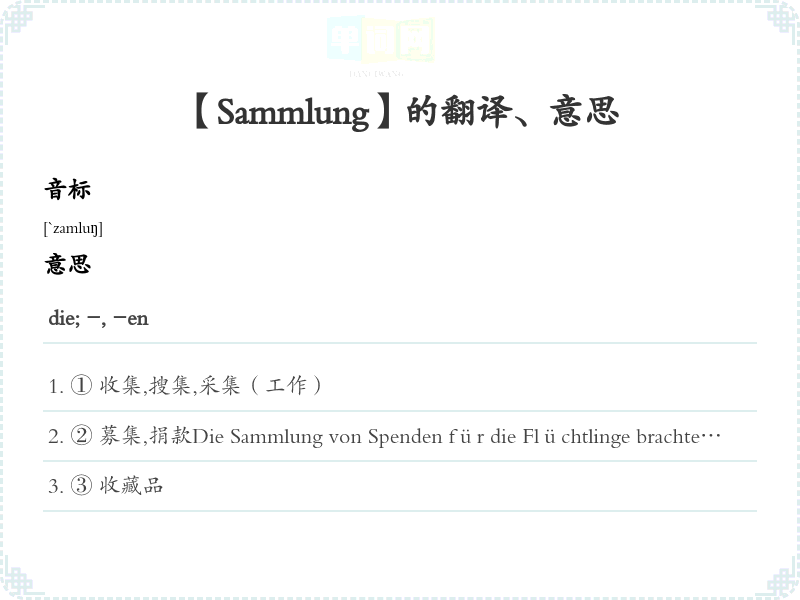 ② 募集,捐款Die Sammlung von Spenden für die Flüchtlinge brachte 200000 Mark.为难民募得捐款20万马克。