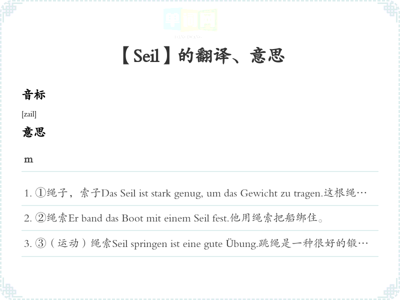 ③(运动)绳索Seil springen ist eine gute Übung.跳绳是一种很好的锻炼。