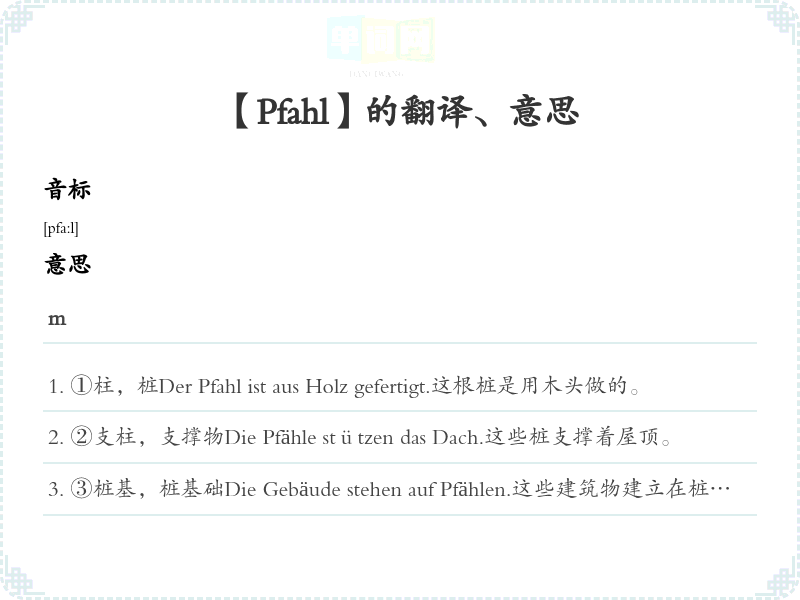 ①柱,桩Der Pfahl ist aus Holz gefertigt.这根桩是用木头做的。