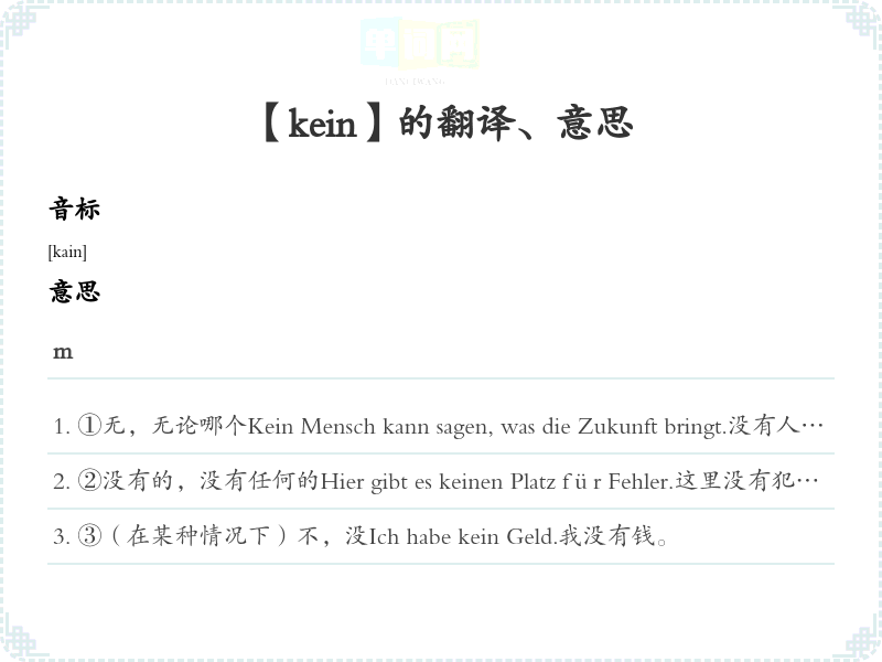 ③(在某种情况下)不,没Ich habe kein Geld.我没有钱。
