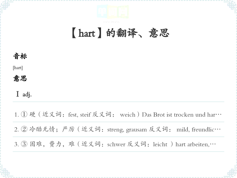 ① 硬(近义词:fest, steif 反义词: weich)Das Brot ist trocken und hart.面包又干又硬。Die Erde ist so ausgetrocknet, dass sie ganz hart ist.土地由于干涸而变硬了。