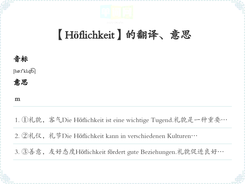 ①礼貌,客气Die Höflichkeit ist eine wichtige Tugend.礼貌是一种重要的美德。
