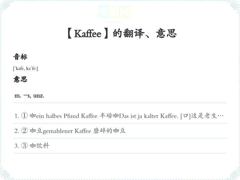 ① 咖ein halbes Pfund Kaffee 半磅咖Das ist ja kalter Kaffee. [口]这是老生常谈。
