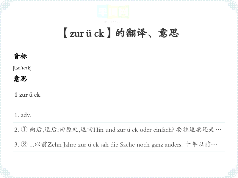 ① 向后,退后;回原处,返回Hin und zurück oder einfach? 要往返票还是单程票?Er ging aus Vorsicht einen Schritt zurück. 小心地后退了一步。