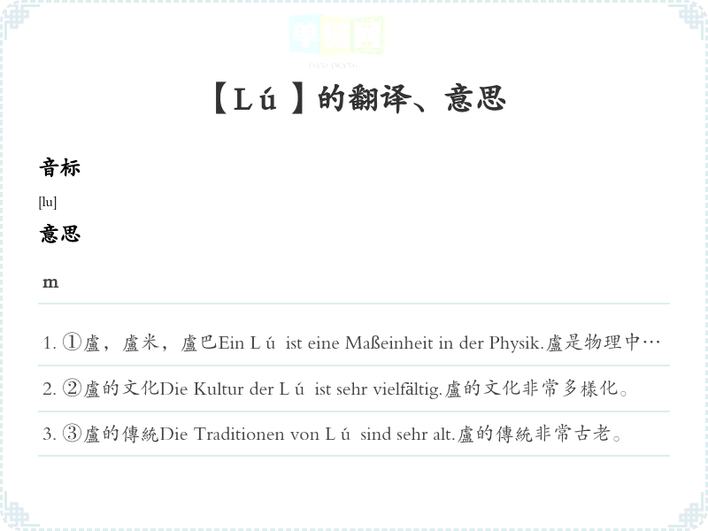 ①盧,盧米,盧巴Ein Lú ist eine Maßeinheit in der Physik.盧是物理中的一種單位。