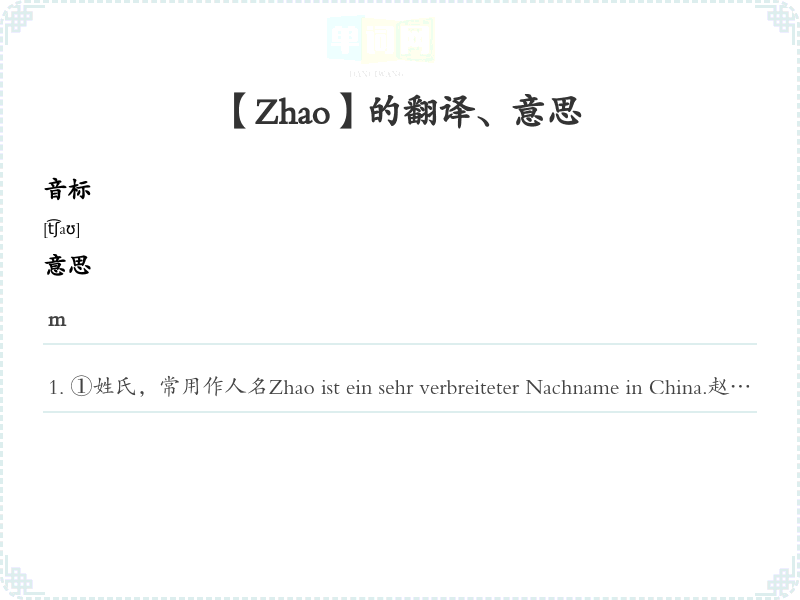 ①姓氏,常用作人名Zhao ist ein sehr verbreiteter Nachname in China.赵是中国一个非常常见的姓氏。