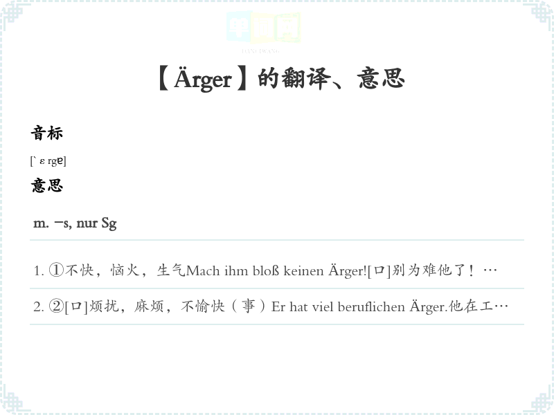 ②[口]烦扰,麻烦,不愉快(事)Er hat viel beruflichen Ärger.他在工作中遇到许多不愉快事。[谚][口]Mach keinen Ärger![谚][口]别惹麻烦!