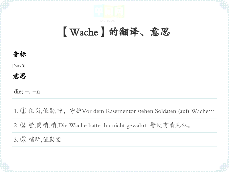① 值岗,值勤,守,守护Vor dem Kasernentor stehen Soldaten (auf) Wache.军营门口有士站岗。