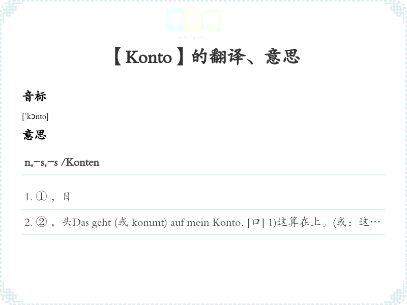 ② ,头Das geht (或 kommt) auf mein Konto. [口] 1)这算在上。(或:这责任该由负。) 2)这是的功劳。