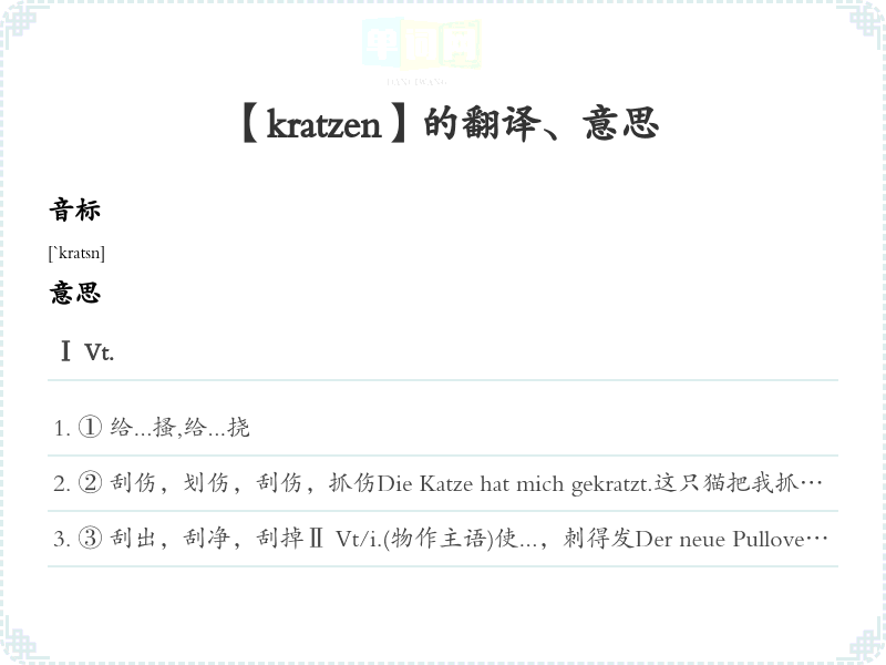 ③ 刮出,刮净,刮掉Ⅱ Vt/i.(物作主语)使...,刺得发Der neue Pullover kratzt (mich).这件新毛衣刺得我。Sein Bart kratzt beim Küssen.他的胡子亲吻时扎得人。Hustenbonbons lutschen, weil man ein Kratzen im Hals verspürt. 的含块咳嗽糖。Ⅲ Vi.
