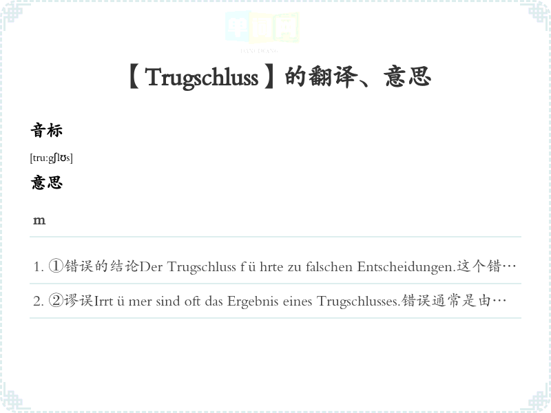 ①错误的结论Der Trugschluss führte zu falschen Entscheidungen.这个错误的结论导致了错误的决策。