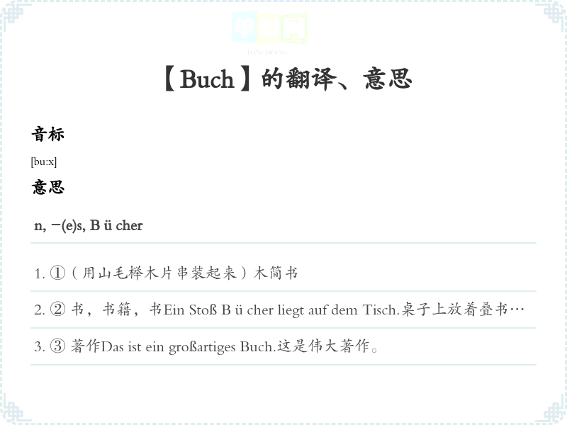 ⑥(商)账簿,账册Das Haus steht mit 80000 Euro zu Buch.这栋房子以八万欧元入账。