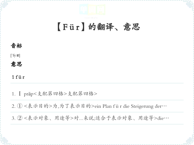 ⑩ <>Schritt für Schritt seinem Ziel näherkommen 逐步接近目标Stueck für Stueck untersuchen 逐件检查Tag für Tag 日复一日,一天天einen Text Wort für Wort übersetzen 逐字逐句翻译一篇文章Mann für Mann trat vor. 一个挨着一个出列。⑾<表示可能性>表示可能性>Nimm für alle Fälle etwas Geld mit! 带点钱去,以防万一!Für den Fall, dass es regnet... ...以防下雨⑿<与was构成固定搭配:was für="" (ein,="" eine,="" ein)...=""> →was I与was构成固定搭配:was>⒀<受某些动词、形容词的支配>受某些动词、形容词的支配>j-n/etw. eintreten 为某人,某事辩护etw. für richtig halten 认为...正确sich für etw. Interessieren 对...有兴趣für etw. kämpfen 为某事而斗争für j-n/etw. sorgen 关心某人/某事Genug für heute! 今天就到这儿!Ⅱ adv.[诗]永久,永远2 Fürdas赞成,拥护