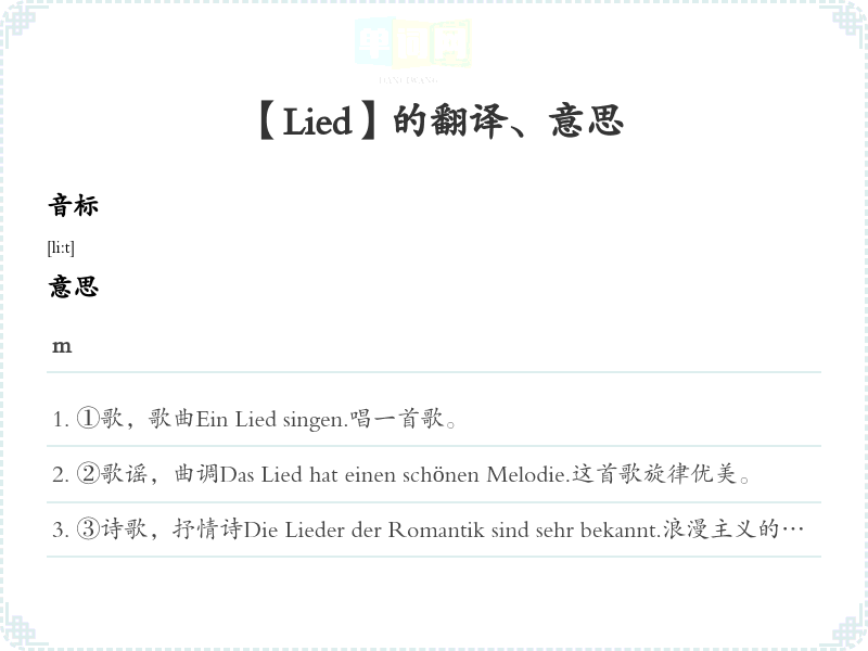 ①歌,歌曲Ein Lied singen.唱一首歌。