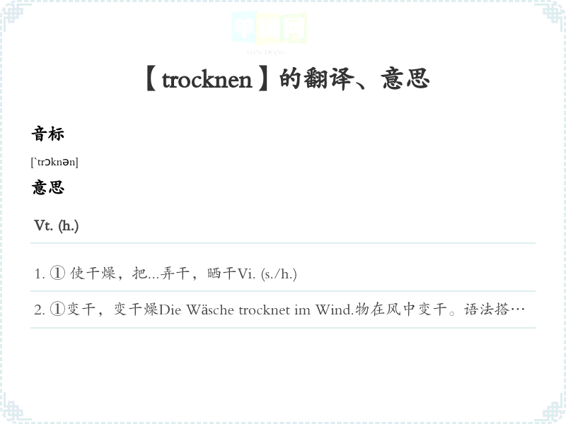 ①变干,变干燥Die Wäsche trocknet im Wind.物在风中变干。语法搭配+四格, sich+四格, mit+三格